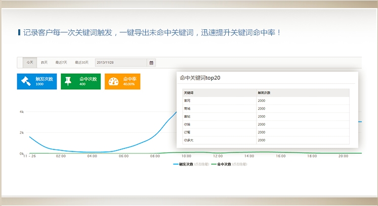 微盟后臺(tái)可以實(shí)時(shí)統(tǒng)計(jì)微信公眾號(hào)的粉絲關(guān)注情況和用戶(hù)語(yǔ)音請(qǐng)求數(shù),根據(jù)統(tǒng)計(jì)對(duì)相關(guān)推廣營(yíng)銷(xiāo)活動(dòng)效果及某些敏感因素對(duì)您的影響作出判斷,并對(duì)相關(guān)市場(chǎng)行為作出相應(yīng)調(diào)整,從一定程度上實(shí)現(xiàn)了對(duì)市場(chǎng)的監(jiān)控與及時(shí)應(yīng)對(duì)。