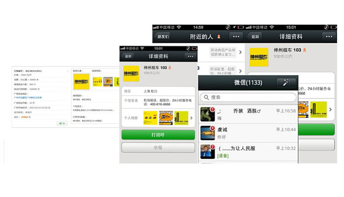 Location Surround Push(基于附近的人的消息推送)微信中基于LBS(基于位置的服務(wù))的功能插件“查看附近的人”便可以使更多陌生人看到這種強(qiáng)制性廣告。 用戶(hù)點(diǎn)擊“查看附近的人”后,可以根據(jù)自己的地理位置查找到周?chē)奈⑿庞脩?hù)。在這些附近的微信用戶(hù)中,除了顯示用戶(hù)姓名等基本信息外,還會(huì)顯示用戶(hù)簽名檔的內(nèi)容。所以用戶(hù)可以利用這個(gè)免費(fèi)的廣告位為自己的產(chǎn)品打廣告。 營(yíng)銷(xiāo)人員在人流最旺盛的地方后臺(tái)24小時(shí)運(yùn)行微信,如果“查看附近的人”使用者足夠多,這個(gè)廣告效果也會(huì)不斷隨著微信用戶(hù)數(shù)量的上升,可能這個(gè)簡(jiǎn)單的簽名欄也會(huì)變成會(huì)移動(dòng)的“黃金廣告位”。